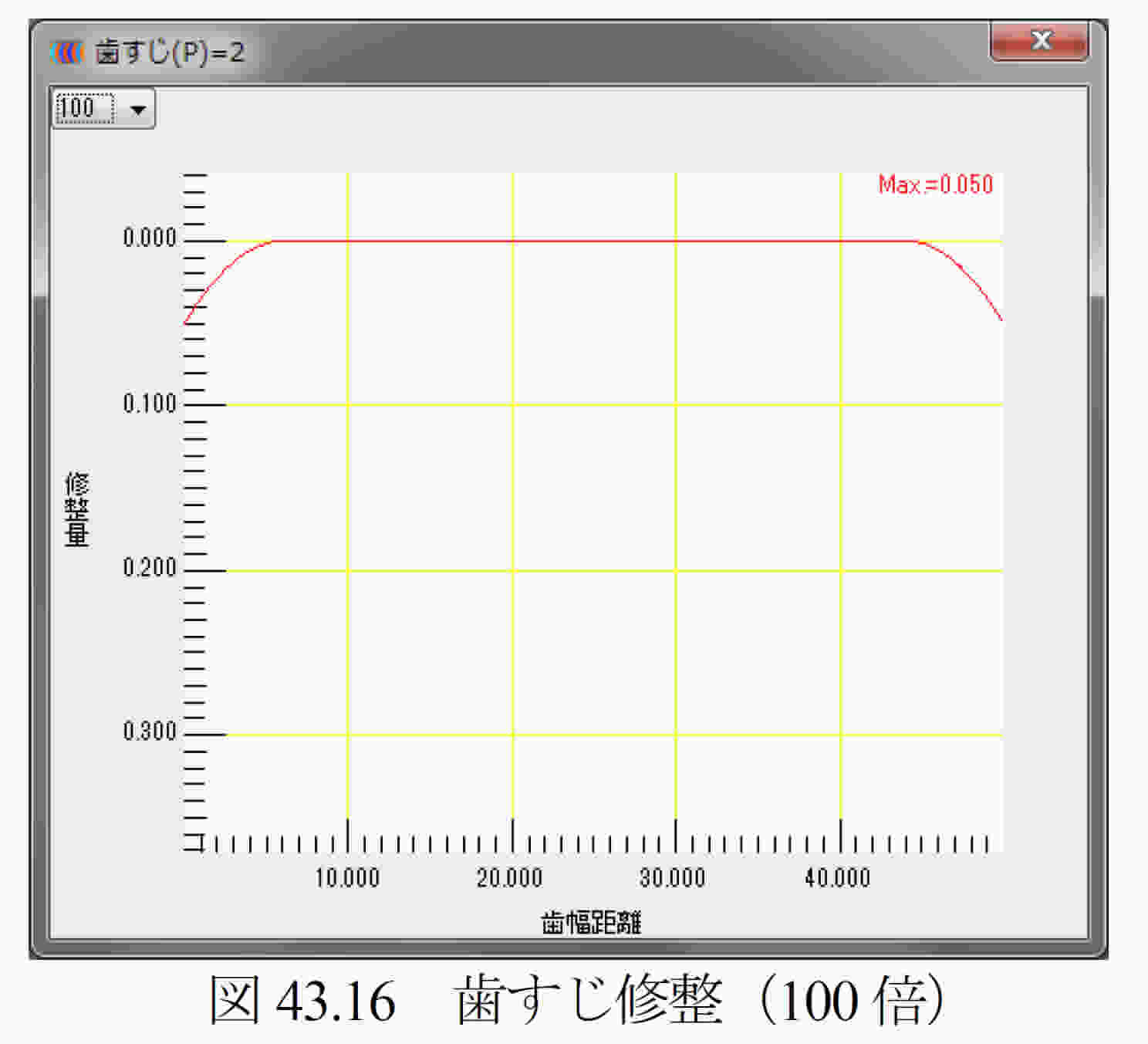 43.7 歯形・歯すじ修整 歯形・歯すじ修整は,図43.12で選択し,歯形修整を図43.13 で,歯すじ修整を図43.14で設定することができます.図43.15に歯形・歯すじ修整の参照図を示します.