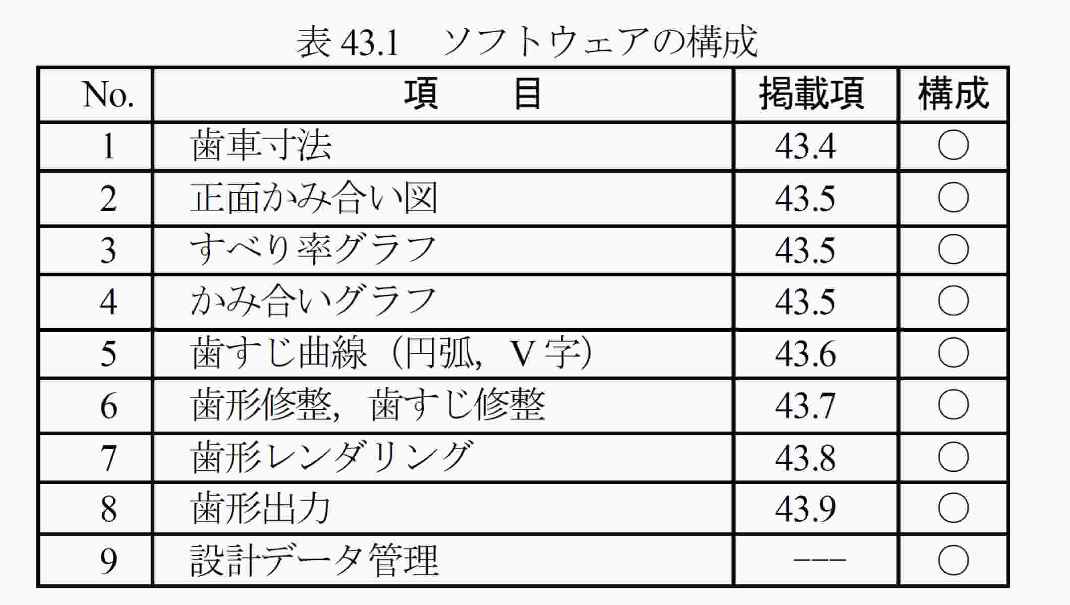43.3 ソフトウェアの構成 円弧歯すじ歯車設計システムの構成を表43.1に示します.表中の○は基本ソフトウェアに含みます. 適応歯車:インボリュート歯車(外歯車)