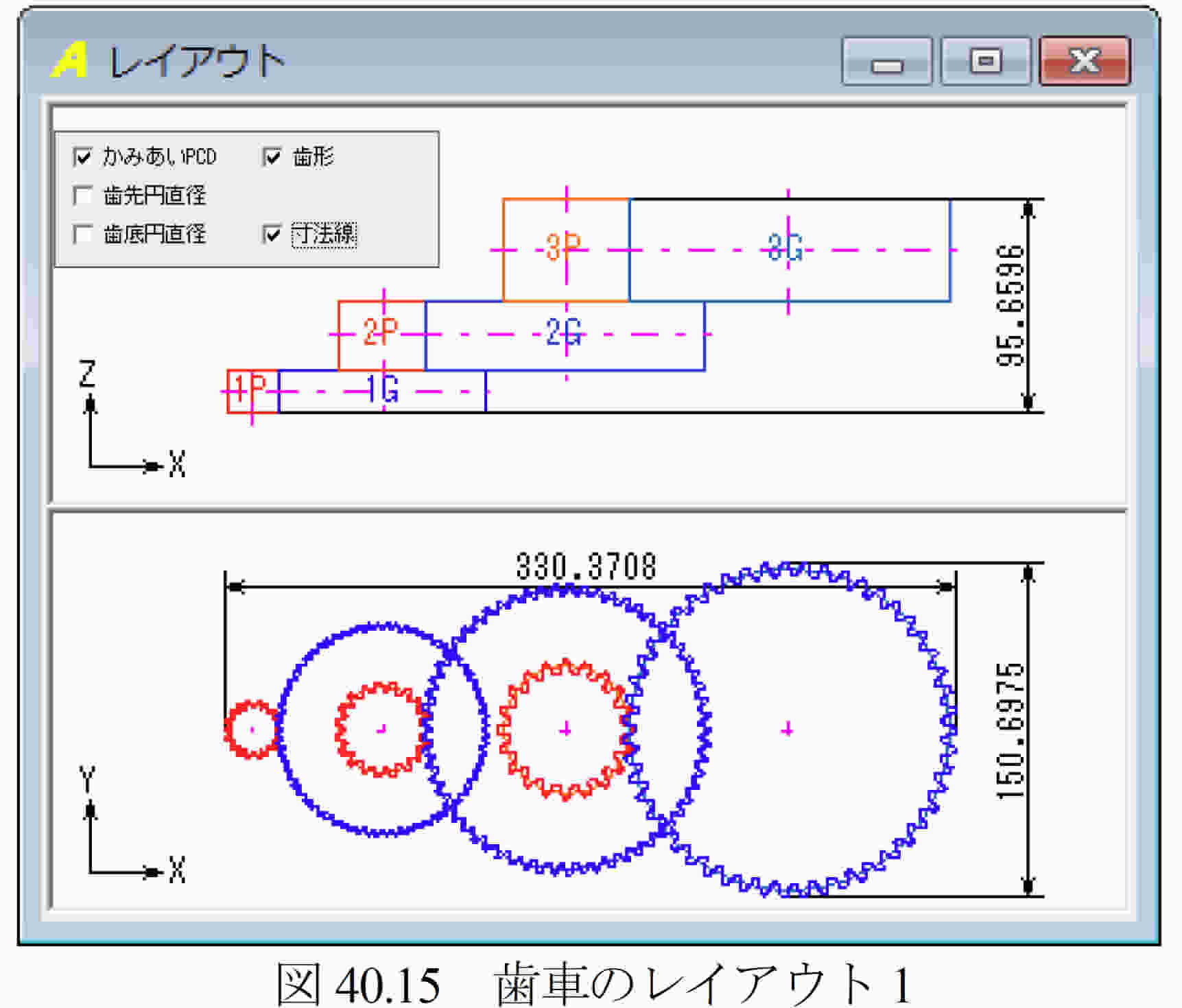 40.9 歯形かみ合い図と歯形レンダリング 図40.14に各段歯車のレイアウトを示します.コントロールフォームにより寸法線や歯形を表示することができます.また,図40.16のように歯車を軸方向に移動して歯車側面に隙間を与えることや,歯車軸をY軸方向に移動することもできます.この歯形レンダリング(オプション)を図40.17に示します. また,歯車軸を移動する処理は,小型の歯車装置(小型モータ減速機等)に適しています.図40.18および図40.19に8段減速歯車を示します.
